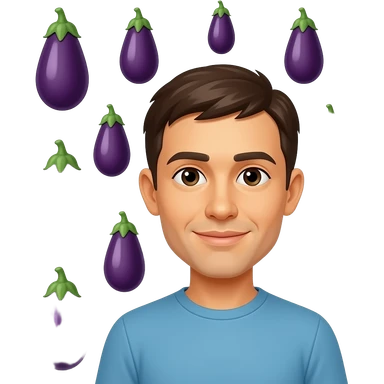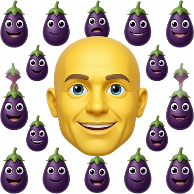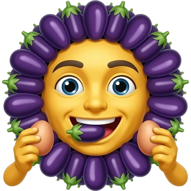 Yellow emoji face surrounded by multiple eggplants with 1 in mouth and 1 in each hand emoji