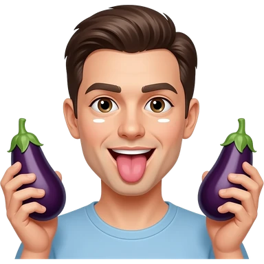 emoji face with tongue sticking out and 1 eggplant in mouth and 1 eggplant in each hand that are squirting white on face emoji