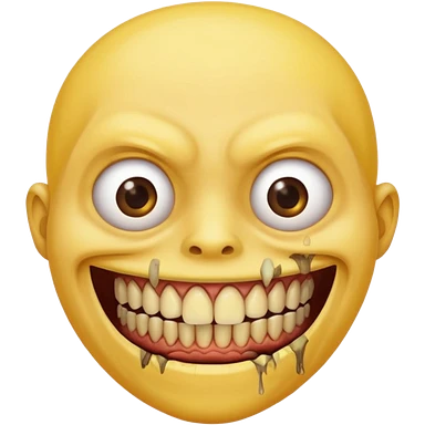 Yellow face emoji with only two teeth white and the rest of the teeth black and rotten, scars on the face and eyes wide with black pupilsemoji