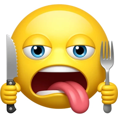 Yellow face classic emoji but hungrily salivating and holding a knife and a fork emoji
