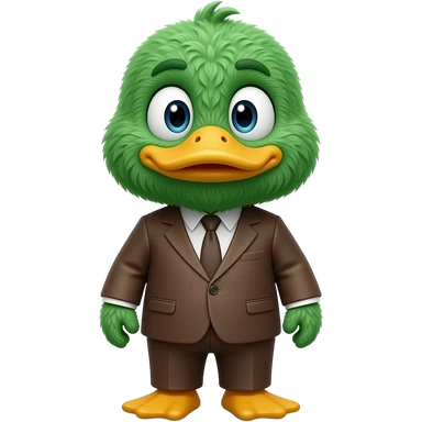 Duck from Don’t Hug Me I’m Scared, fluffy green puppet Duck character with a yellow beak, cartoon eyes, and wearing a brown suit emoji