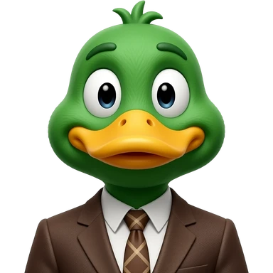 Duck from Don’t Hug Me I’m Scared, green puppet Duck character with a yellow beak, cartoon eyes, and wearing a brown suit emoji