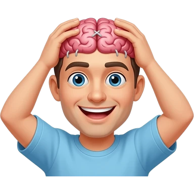 a guy pulling the top of his head off held together by stitches showing his brain which has a mout h and is smiling saying in text "You GOt Me" emoji