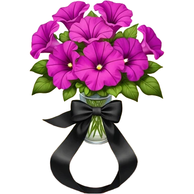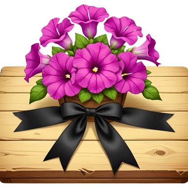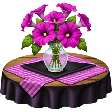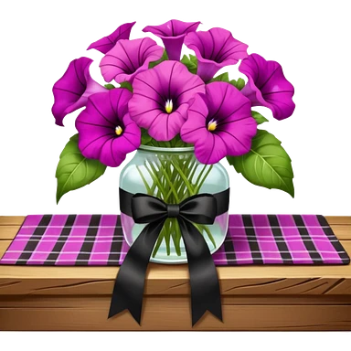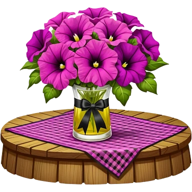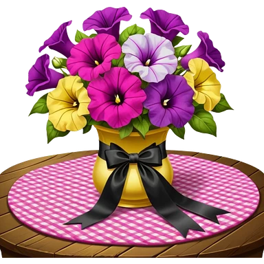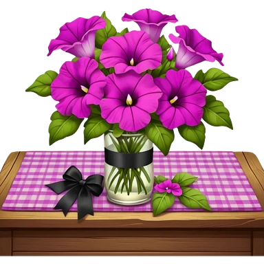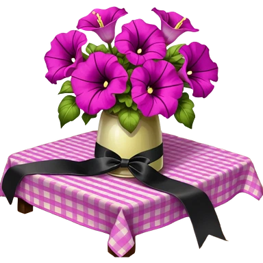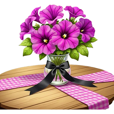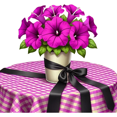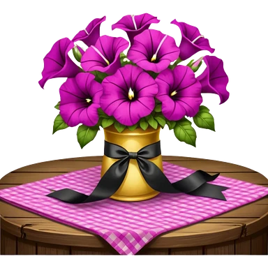 A lush bouquet of bright light margenta color petunia black satin ribbon, resting on an antique wooden table, with a pale yellow and pink plaid pattern table cloth emoji