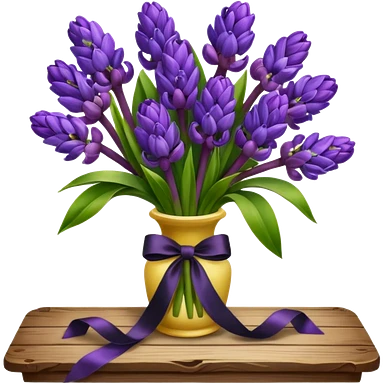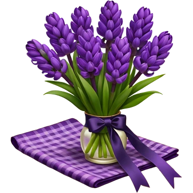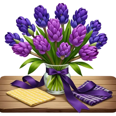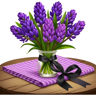 A lush bouquet of bright prple color Hyacinths black satin ribbon, resting on an antique wooden table, with a pale yellow and pink plaid pattern table cloth emoji