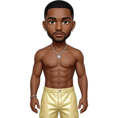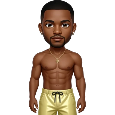Usher with brown eyes, black buzz cut hair, pale yellow metallic baggy pants, shirtless with necklace and earrings emoji