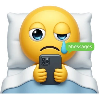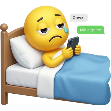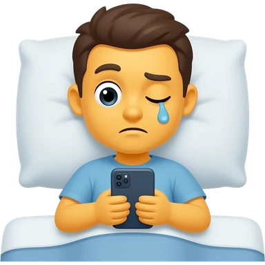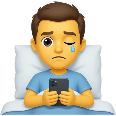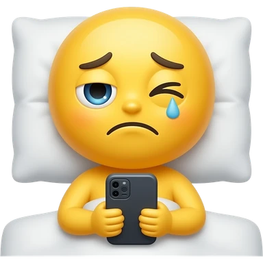 Yellow emoji face that looks tired & sleepy with 1 eye open & 1 eye shut reading phone messages in bed emoji