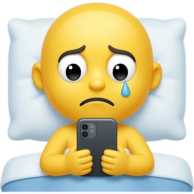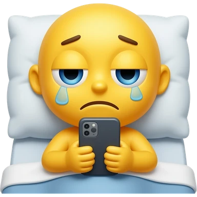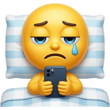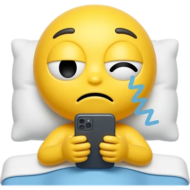 Cute & funny good morning yellow emoji face that looks tired with bags under eyes and has only one eye open and the other eye shut checking phone messages in bed emoji