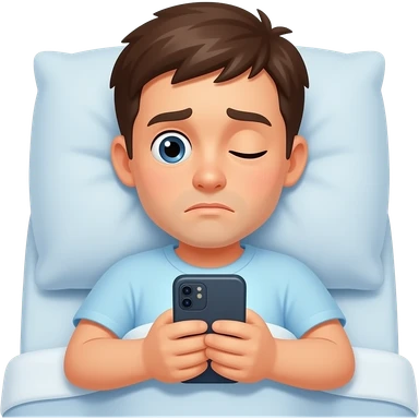 Cute & funny good morning yellow emoji face that looks tired in bed and has only one eye open and the other eye shut reading phone messages emoji