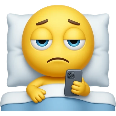Yellow emoji face that looks tired & sleepy with one eye open and one eye shut checking phone messages in bed emoji