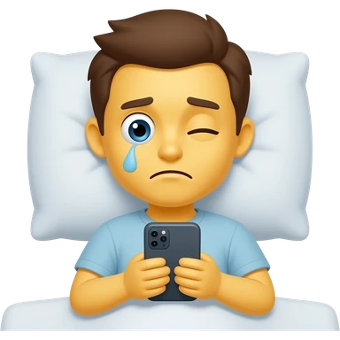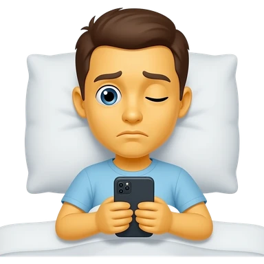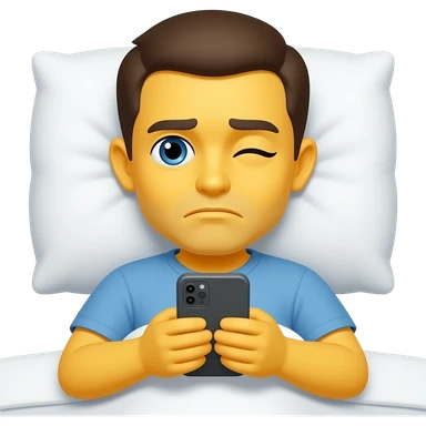 Yellow emoji face that looks tired with one eye open and one eye shut checking phone messages in bed emoji