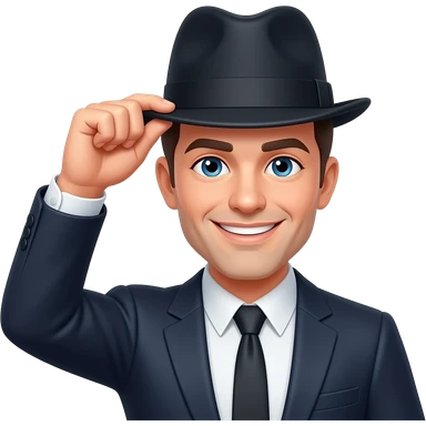 yellow round smirking emoji with a smirk face tipping a fedora with one hand. The fedora is tilted emoji | AI Emoji Generator