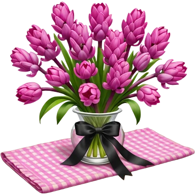 A lush bouquet of bright pink color Hyacinths black satin ribbon, resting on an antique wooden table, with a pale yellow and pink plaid pattern table cloth emoji