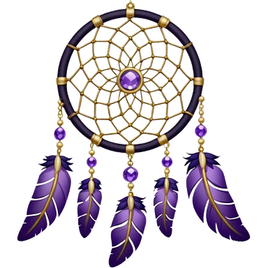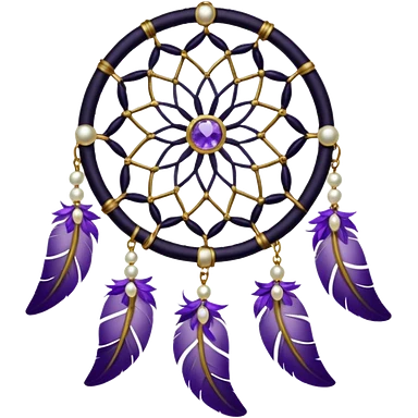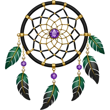 Black dreamcatcher with amethyst crystals, gold pearls, and plants, and violet and white feathers emoji