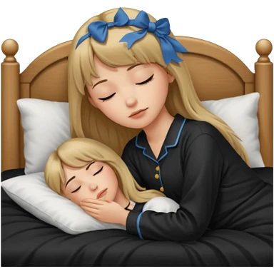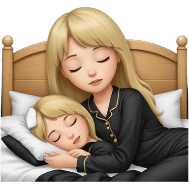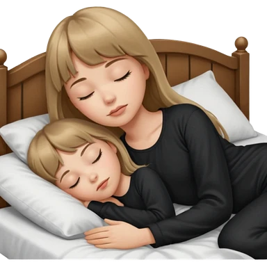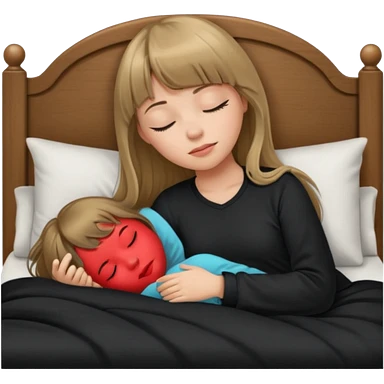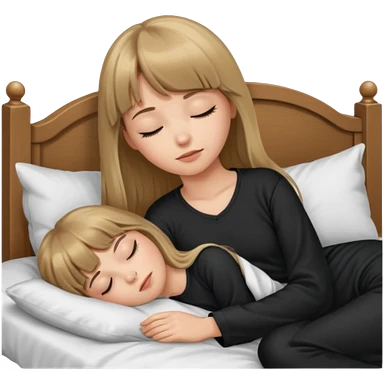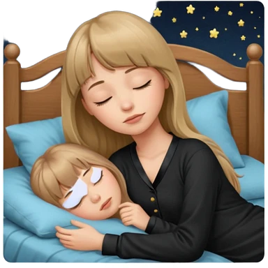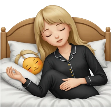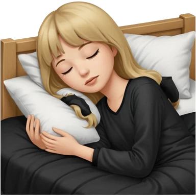 Young woman with long dark blond hair all around her, and a bang, sleeping in bed with black pyjama emoji
