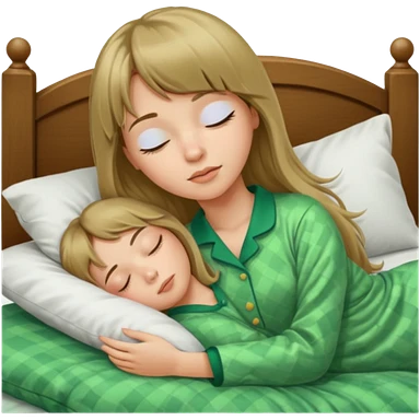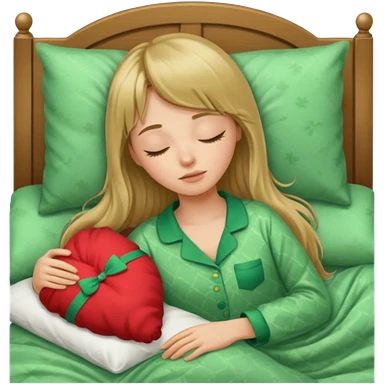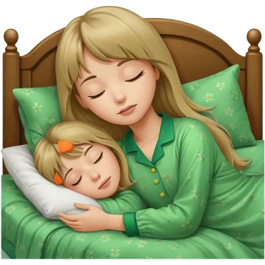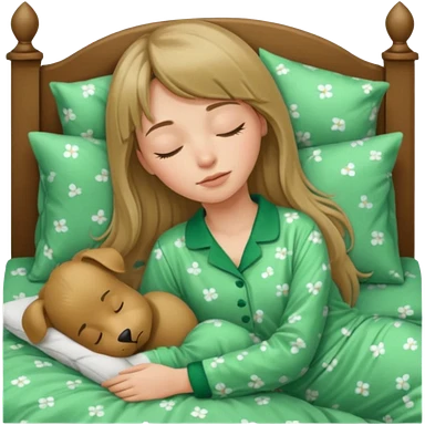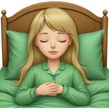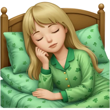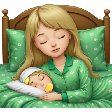 Young woman with long dark blond hair and a bang sleeping in bed with green pyjama emoji