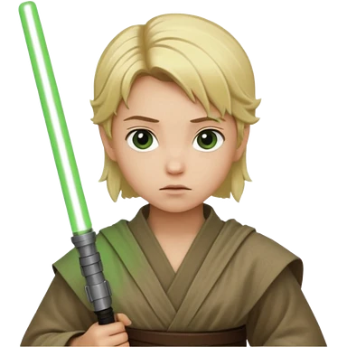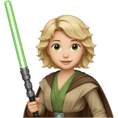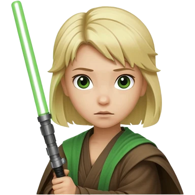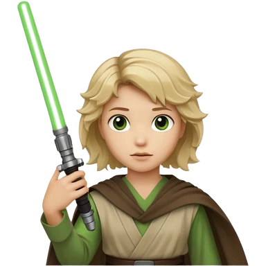 Young jedi with sandy blonde wavy short hair holding a green light saber. With brown eyes emoji