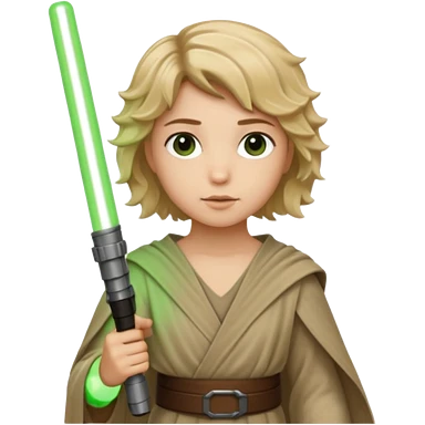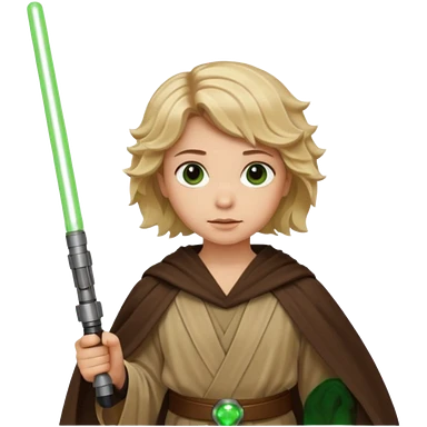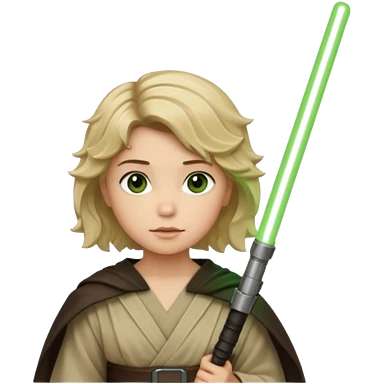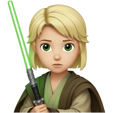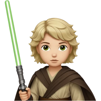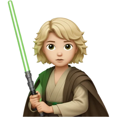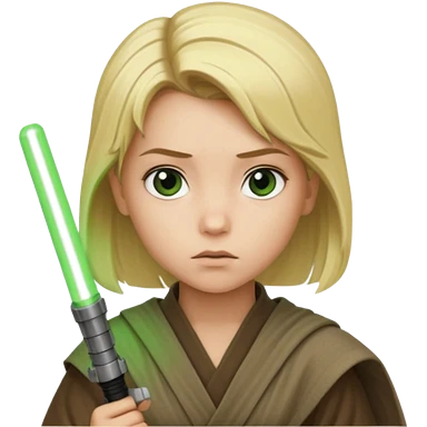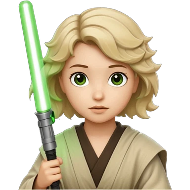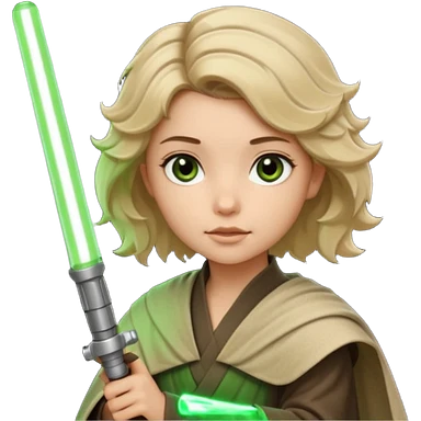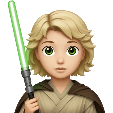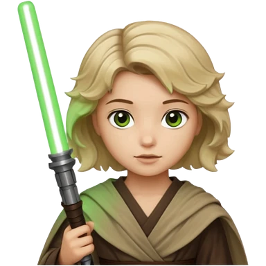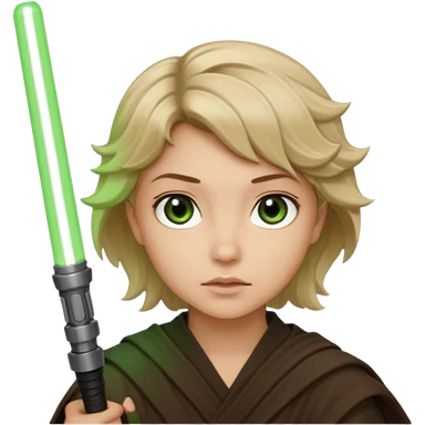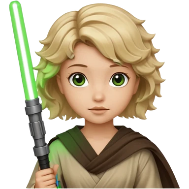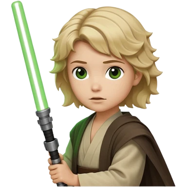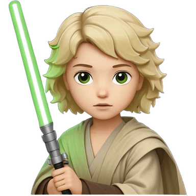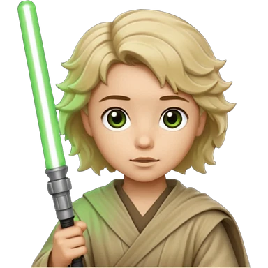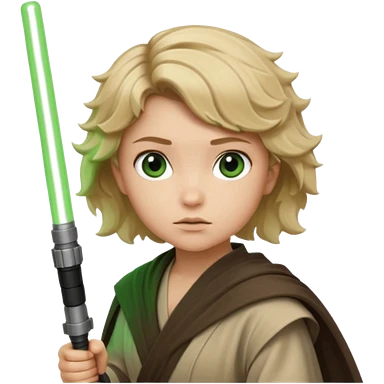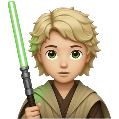 Young jedi with sandy blonde wavy short hair holding a green light saber, he has brown eyes emoji