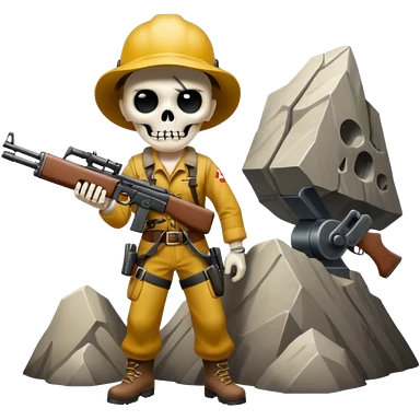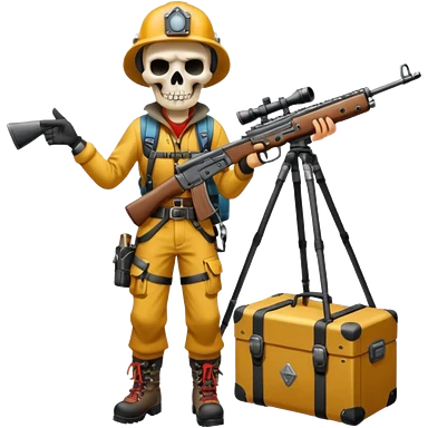 Yodeling mountain climber in Switzerland with a machine gun pointing to the right, full body. in the style of your bleeding skull art make him look like the price is right game emoji
