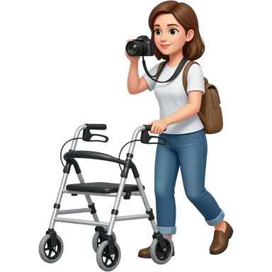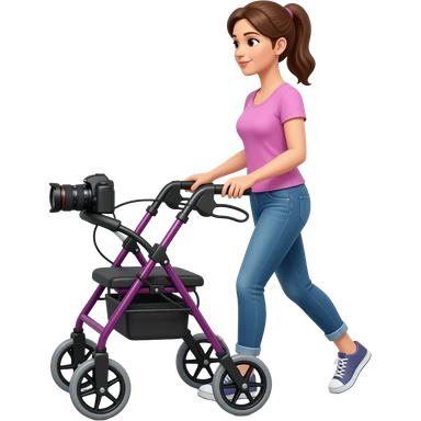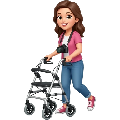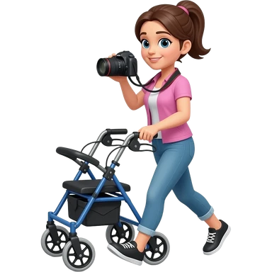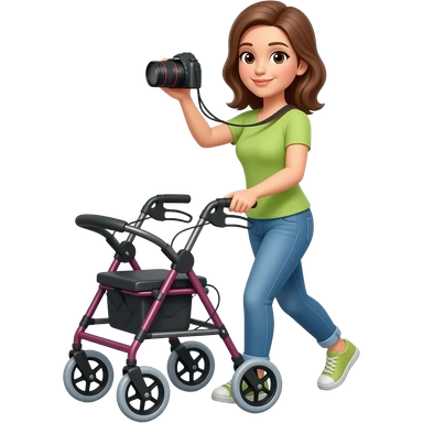 vrouw met fotocamera achter sportieve outdoorrollator lopen,rollator sportiever uiterlijk geven emoji