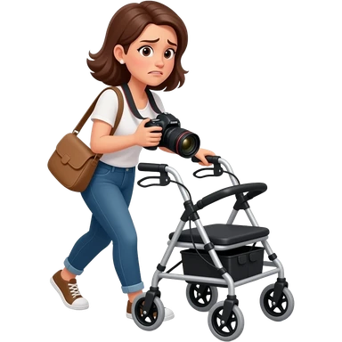vrouw met fotocamera achter outdoor rollator lopen, rollator is te suffig emoji