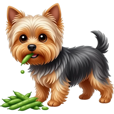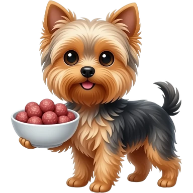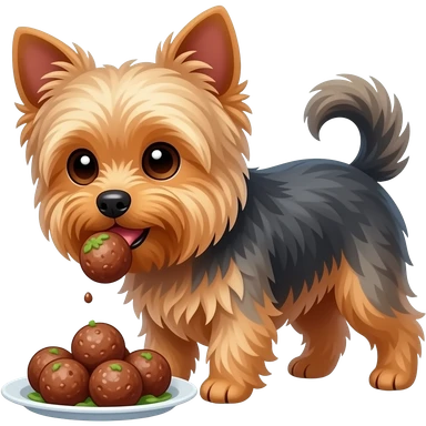 Yorkie dog jumping mouth open with baked chicken and noodles emoji