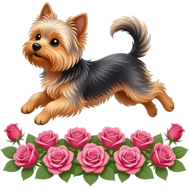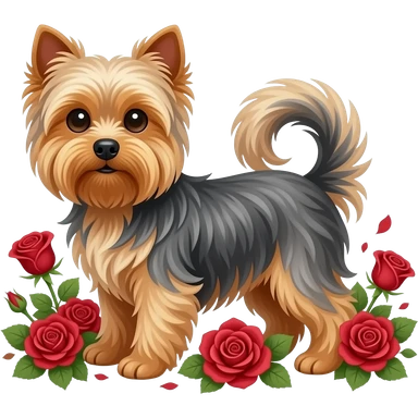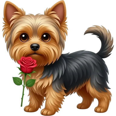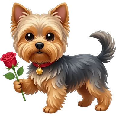 Yorkie dog droopy ears long tail holding a rose with hearts emoji