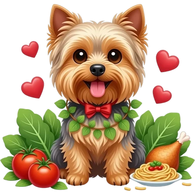 Yorkie dog smiling tongue out sitting among ivy, tomatos, spinach, chicken and pasta and floating hearts emoji