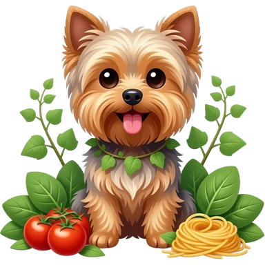 Yorkie dog smiling tongue out sitting among ivy, tomatos, spinach and pasta emoji
