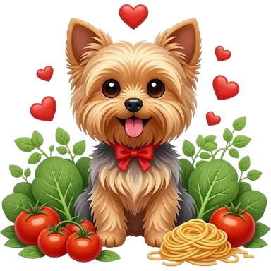 Yorkie dog smiling tongue out sitting among a lot of ivy, tomatos, spinach, chicken and pasta and floating hearts emoji