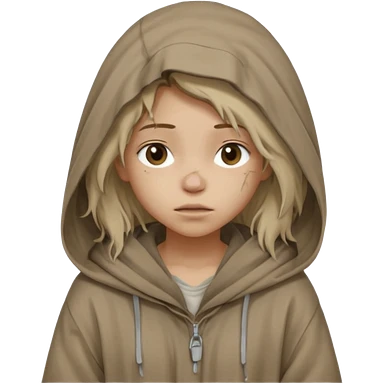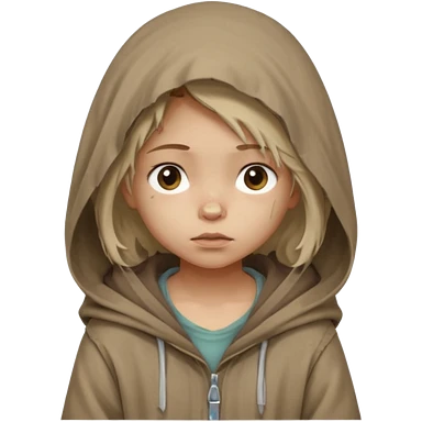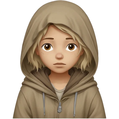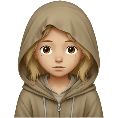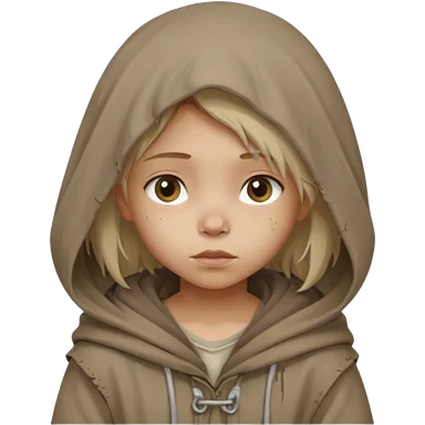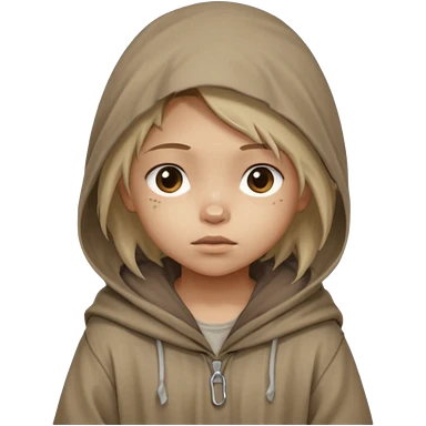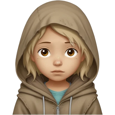 Young beggar little girl character, chest-up portrait, wearing worn and oversized clothes, hair is visible, neutral earth-tone fabric, slightly messy hair peeking from under a hood, tired but gentle eyes, subtle dirt marks on face, emoji