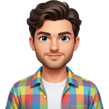 young adult man with light skin, short beard, dark wavy hair, smug expression, colorful open shirt and white t-shirt emoji