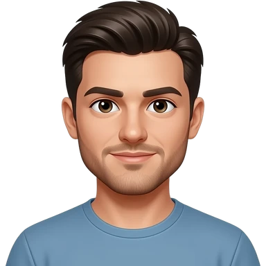 young adult man with light skin, short beard, dark brushed back hair, dark eyes, smug expression, emoji