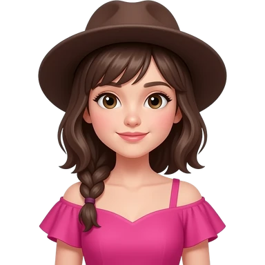 a beautiful girl with think features wear vibrant pink color clothes wide shoulders and wear dark brown hat emoji