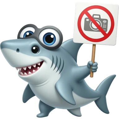 Generame una imagen en la que un tiburón esté con una aleta diciendo no a las cámaras o como que haciendo referencia que no le gustan las cámaras o las fotos emoji