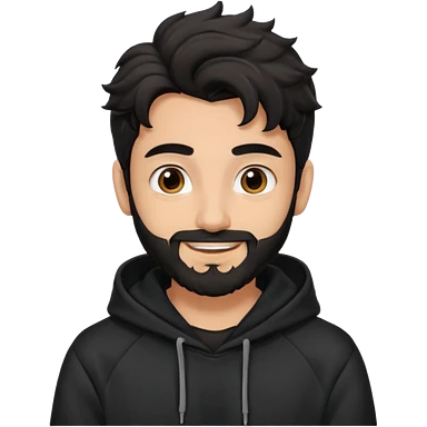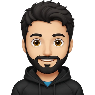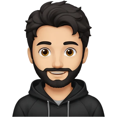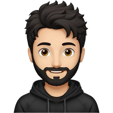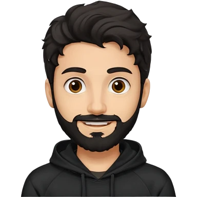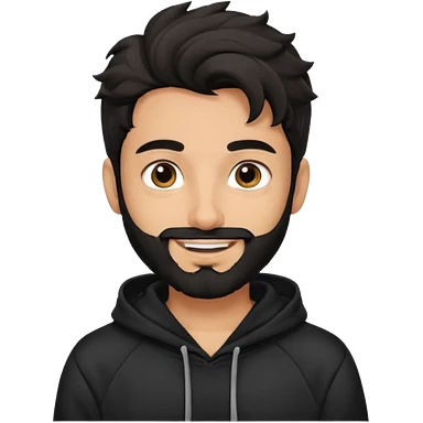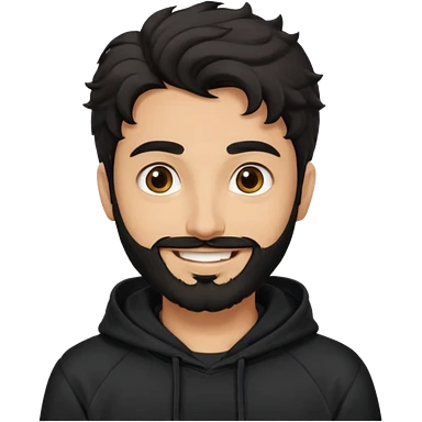 young fair skin pakistani guy smiling with black beard, wavy hair pushed back and brown eyes and thick eyebrows wearing black hoodie emoji