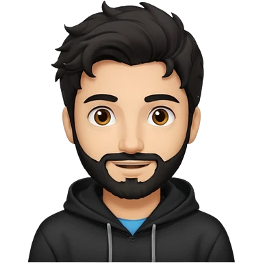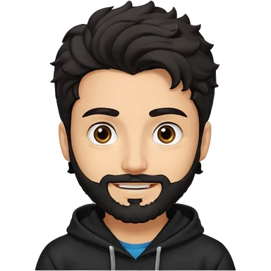 young fair skin pakistani guy smiling with black beard, wavy hair pushed back and brown eyes and big eyebrows, wearing black hoodie emoji