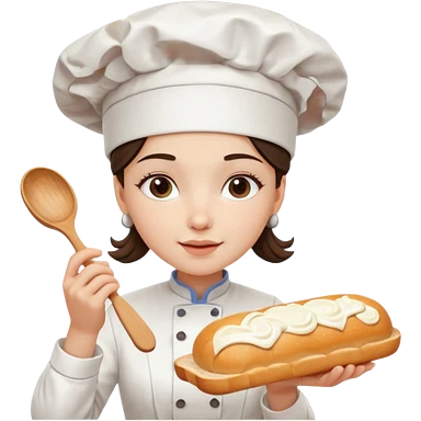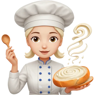 Young female baker - white chef hat, holding cream piping bag to milk oil on bread emoji
