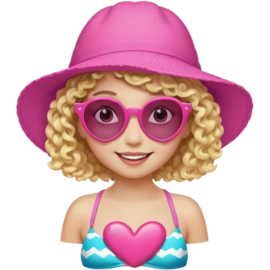 smiling young girl, short curly blonde hair, white skin, pink floppy hat, heart-shaped sunglasses, colorful bikini emoji