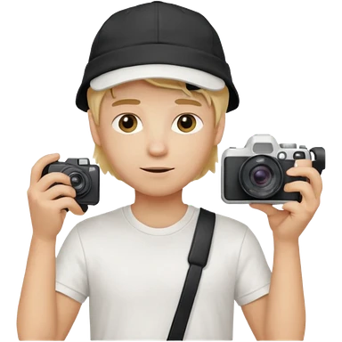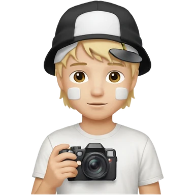 Young male, holding camera, white t-shirt, cap, blond hair emoji | AI Emoji Generator