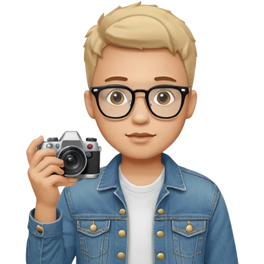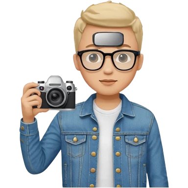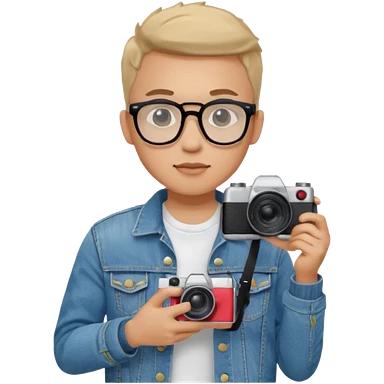 Young male, holding camera, jean jacket with white t-shirt inside, glasses emoji