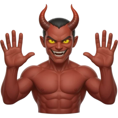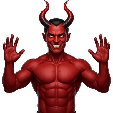 “Red devil, muscular torso, horns, glowing eyes, evil grin, both hands raised, open palms up, symmetrical, dark background, high detail” emoji