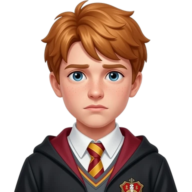 wizard young man, 18-19 years old, ginger hair, light freckles, serious slightly worried expression, wearing school robe and tie, gold and red colors, head-and-shoulders portrait, centered, 3D glossy emoji style, clean background emoji