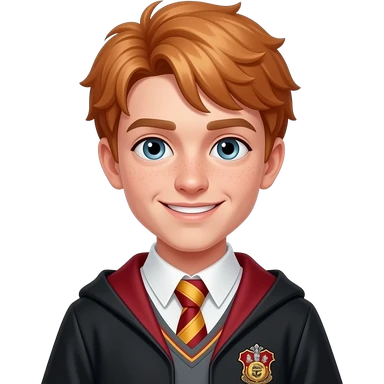 wizard young man, 20-21 years old, ginger hair, light freckles, smug grin expression, wearing school robe and tie, gold and red colors, head-and-shoulders portrait, centered, 3D glossy emoji style, clean background emoji