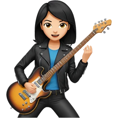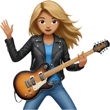 Young woman – standing on stage, leather jacket, playing electric guitar, energetic pose emoji | AI Emoji Generator