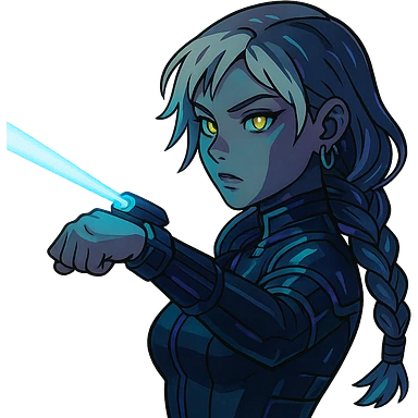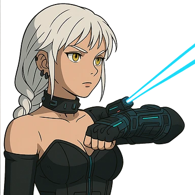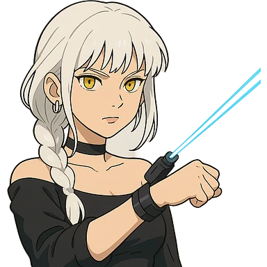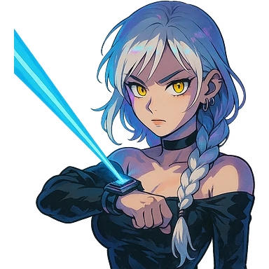 young woman with gold yellow eyes, white hair, long braid, black off-shoulder top, punk gothic style, futuristic cyberwave cyberpunk,, she is calmly t-posing , there is a small bonfire in front of her illustration | AI Emoji Generator