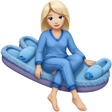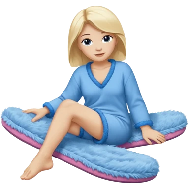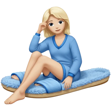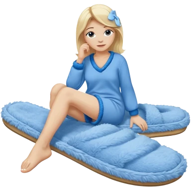 blonde woman wearing comfy lounging outfit, blue fuzzy slippers on her bare feet emoji