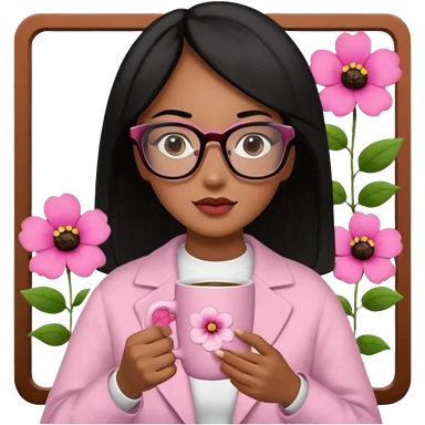 Chica de pelo negro ojos negros y piel morena con lentes oversize square con ropa bonita m pantallas pequenas de cristal , en la mano derecha una taza de cafe en color rosa con una flor negra de diseno. Sentada mirando la television. emoji