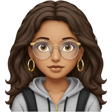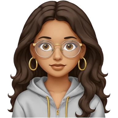 Make a girl with dark brown wavy hair and brown eyes she's tan latina and she has clear glasses and small hold hoop earings make her hair longer and her a hoodie emoji