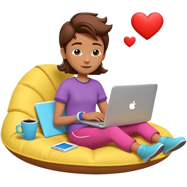 3D clay character relaxed with laptop and coffee, floating icons (envelope, heart, dollar), colofrful outfit, floating icons, white laptop, Pixar style, transparent background emoji